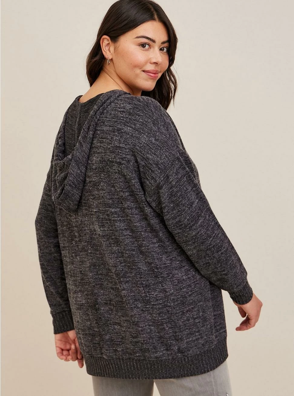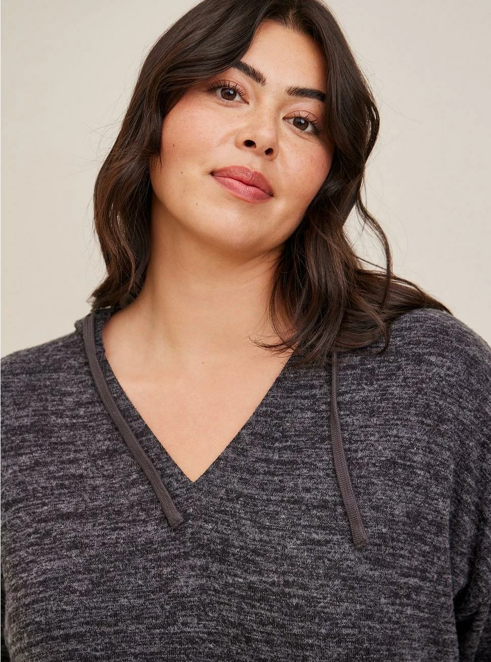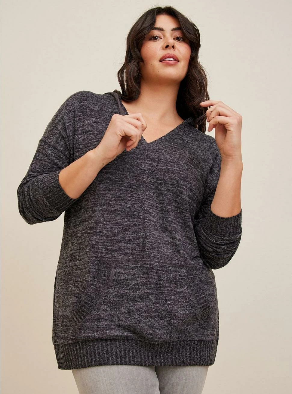 This Super Soft hoodie tunic features long sleeves with a drop shoulder, drawstring hood, and front kangaroo pocket.